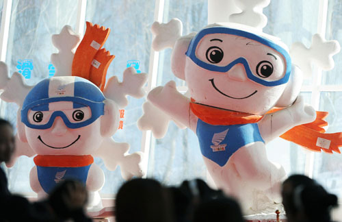 2月17日,大冬会吉祥物“冬冬”在亚布力滑雪中心显得格外引人瞩目。第24届世界大学生冬季运动会将于2月18日在哈尔滨市开幕,雪上赛事将在帽儿山、亚布力滑雪场举行。 新华社记者 徐家军摄