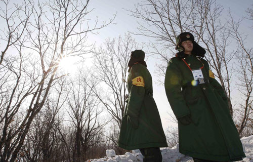 2月17日,两名武警黑龙江森林总队战士在大冬会帽儿山赛场的最高点执勤。武警黑龙江省森林总队主要负责第24届世界大学生冬季运动会帽儿山分赛场的安全布控任务。 新华社记者 廖宇杰摄