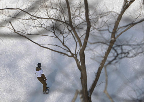 2月17日,参加单板滑雪平行大回转比赛的选手在比赛场地进行训练。 当日,第24届世界大学生冬季运动会单板滑雪平行大回转项目的正式训练在帽儿山赛区进行。 新华社记者 廖宇杰摄