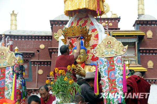 4月9日,强巴林寺僧人为花车上的强巴佛像戴上头饰。新华社记者 李月摄