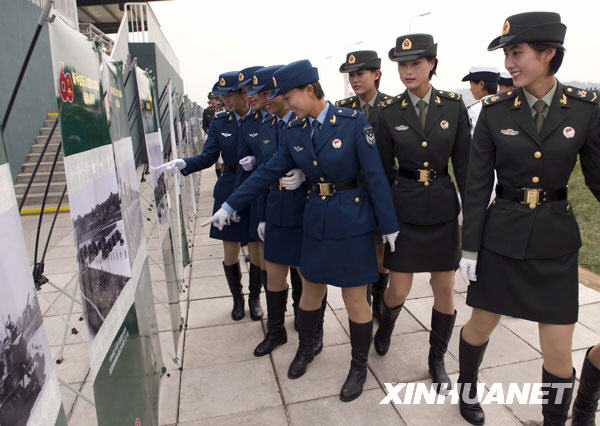 9月24日,阅兵村中的女兵在参观阅兵图片展。新华社记者刘杰摄
