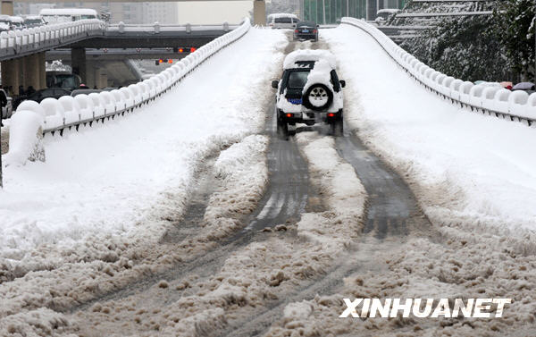 11月12日,车辆在郑州一座立交桥上缓慢行驶。 当日,河南省内大范围雨雪天气基本停止。相关统计资料显示,此番降雪创下多个历史极值,其中局部地区积雪深度甚至突破百年一遇。新华社记者朱祥 摄
