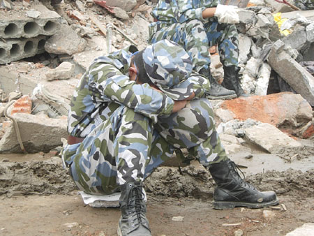 2008年5月16日,四川什邡市汉旺镇东汽中学废墟旁,战士们连续奋战,疲惫不堪。