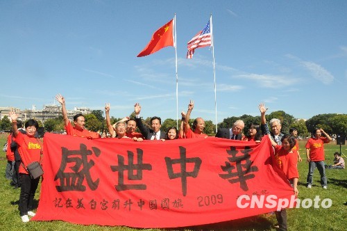 九月二十日,上千名旅居美国的华人华侨在美国首都华盛顿美国总统府南面外侧的公共草坪上举行盛大的庆祝活动,同时举行隆重的升中美两国国旗仪式,这也是中国国旗第一次由民间组织在白宫前方的公共草坪上升起。图为升旗仪式后,中国驻美大使周文重与当地华人华侨一同展示一面从天安门国旗护卫队拿过来的巨大五星红旗。中新社发 吴庆才 摄