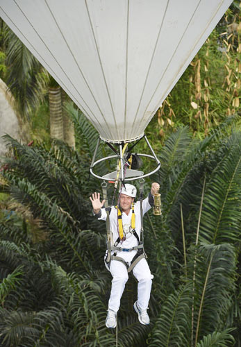 Adventurer and television presenter Ben Fogle carries the Olympic lantern on a tree pruning helium balloon in a biodome at the Eden Project near St Austell in Cornwall, southwest England, May 19, 2012. [Photo/Agencies] |