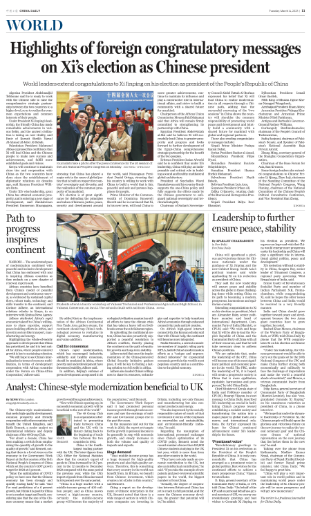 Highlights of foreign congratulatory messages on Xi's election as Chinese president