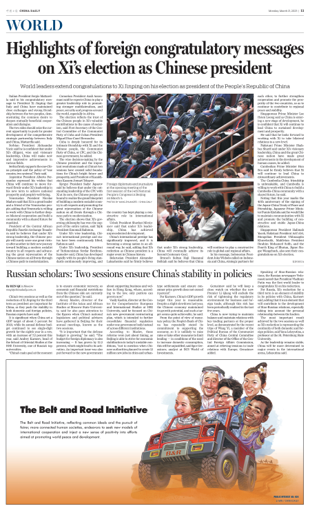 Highlights of foreign congratulatory messages on Xi's election as Chinese president