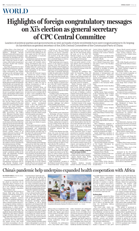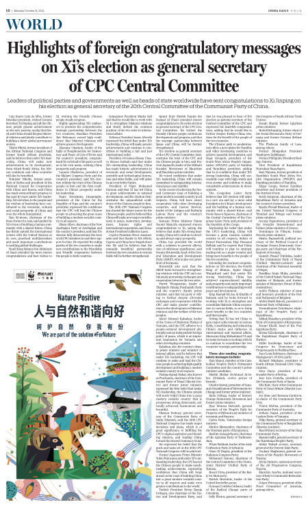 Highlights of foreign congratulatory messages on Xi's election as general secretary of CPC Central Committee