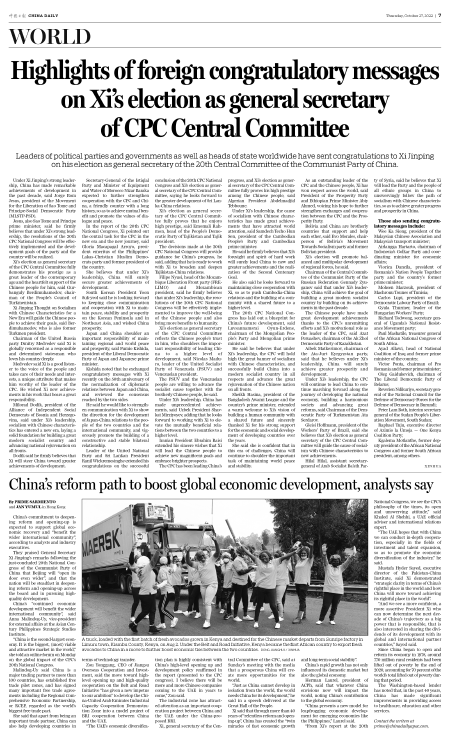 Highlights of foreign congratulatory messages on Xi's election as general secretary of CPC Central Committee