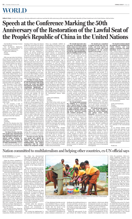 Speech at the Conference Marking the 50th Anniversary of the Restoration of the Lawful Seat of the People's Republic of China in the United Nations