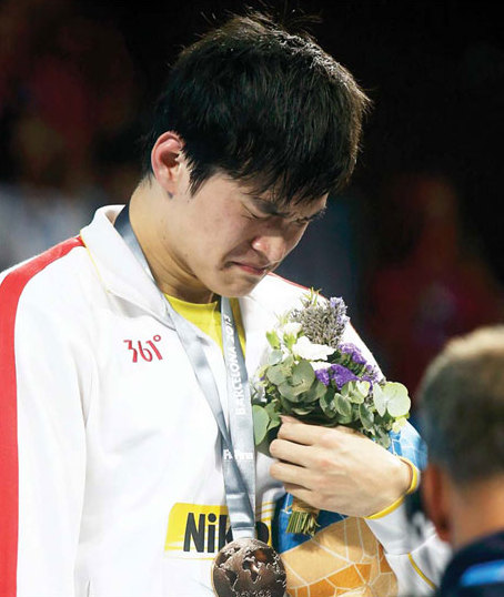 | Sun Yang reacts after receiving his gold medal during the World Swimming Championships in Barcelona, July 31. Photos by China Photo Press |