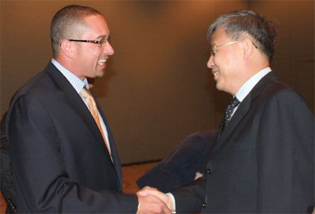 | Santa Clara, CA BUSINESS TALKS Shandong Governor Guo Shuqing (right) talks with Kish Rajan, director of the office of business and economic development for California governor Edmund Brown, on May 30 in Santa Clara. More than 200 local business professionals listened to the project presentations of the Shandong business delegation. Qidong Zhang / China Daily |