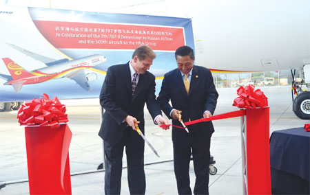 | Everett, WA RIBBON CUTTING Mu Weigang (right), vice-president of Hainan Airlines, and Jeffrey E. Klemann, vice-president of 787 delivery operations at Boeing’s Everett delivery center, cut ribbons to celebrate the seventh Boeing 787 Dreamliner delivered to Hainan Airlines at a ceremony in Everett, Washington on May 30. Deng Yu / China Daily |
