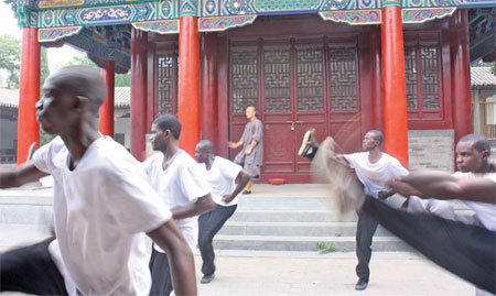 | Shi Yanbo teaches African followers kung fu at Shaolin Temple. Joseph Catanzaro / China Daily |