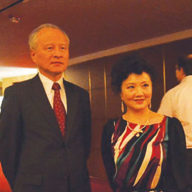 Washington: Opera night The Chinese Ambassador to the US Cui Tiankai (left) poses with Xueling Qin, founder of Washington Shaling Beijing Opera, on Wednesday after Peking opera master Mei Baojiu and his troupe performed The Goddess of Heaven Scatters Flowers, LianJinfeng, Pierce of Mussel, Resisting Jin Troops, Farewell My Concubine, and Drunken Beauty at the Kennedy Center in Washington. Liu Chang / China Daily |