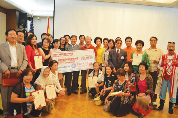 | Los Angeles: A donation certificate China's Consul General Liu Jian (third from right) hands over a donation certificate to Cai Chenghua (third from left), president of the Chinese American Federation, at the office of the Consulate General of China in Los Angeles on Aug 25. The Chinese American Federation donated $50,000. Cindy Liu / China Daily |