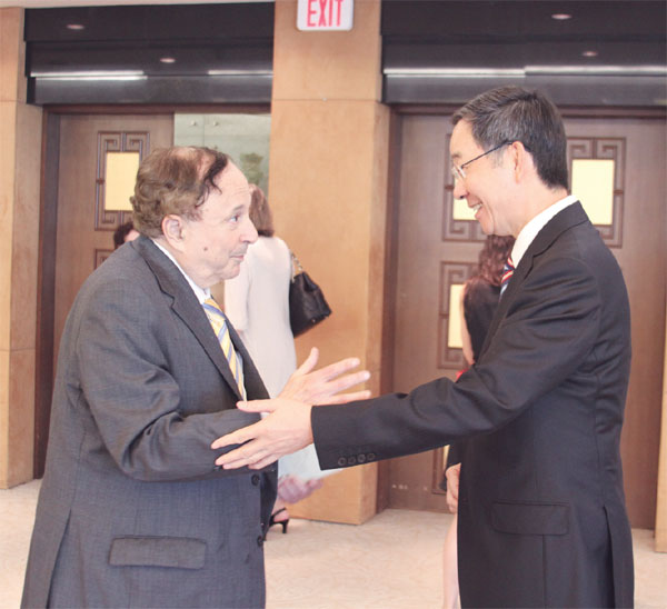 | Warm welcome Sun Guoxiang (right), Chinese Consul General in New York, welcomes a member of the United Nations Association of New York to an open house on Thursday at the Chinese Consulate General in New York. The theme of the open house was to experience China. Hu Haidan / China Daily |