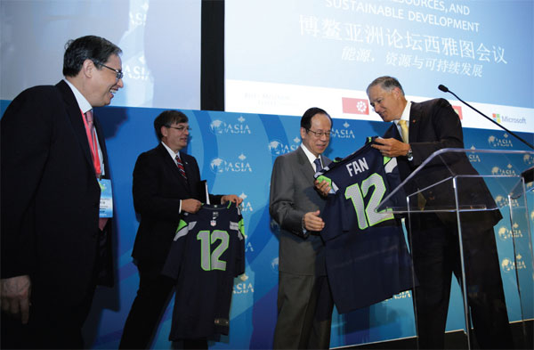 | Special gift Washington State Governor Inslee (right) presents Boao Forum for Asia Chairman Fukuda (second from left) and Secretary General Zhou Wenzhong (left) with Seattle Seahawks jerseys. Deng Yu / China Daily |
