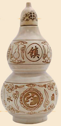 In the famous Chinese novel Journey to the West, a demon defeated the mighty Monkey King with his magic gourd, which sucked our hero into captivity with almost no effort at all. In traditional Chinese folklore, the gourd possesses even more magical powers than simply swallowing bad spirits and is believed to have health benefits due to its ancient use as a holder of medicines. It is also associated with fortune and good luck due to its "esthetic" shape. It is believed that harmony and health comes to the family that puts a gourd near the bed, hangs it behind the door or places it in the kitchen near the stove.