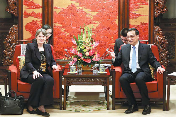 | Premier Li Keqiang talks with United Nations Development Program Administrator Helen Clark in Beijing on May 4. Li said he appreciates the UNDP's work in reducing poverty and hunger, as well as its disaster relief and rescue efforts. Clark said the world should learn from China's experience in alleviating poverty, and she spoke highly of the nation's constant support for the UNDP. China and the agency pledged to work together for the world's sustainable development. Feng Yongbin / China Daily |