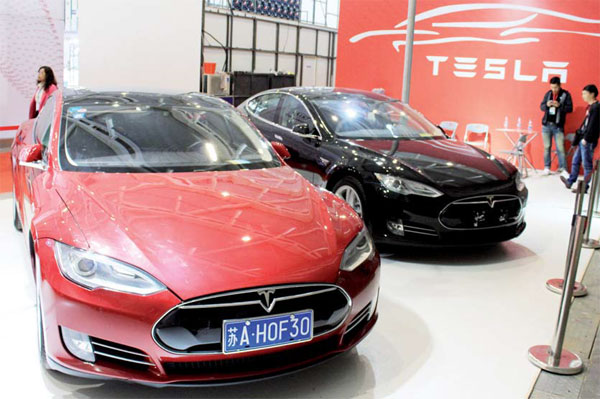 | Tesla presents its cars at a new-energy vehicle exhibition in Nanjing, Jiangsu province, on April 17. Provided to China Daily |
