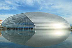 The titanium and glass dome is surrounded by an artificial lake. It contains an opera house, concert hall and theater. Altogether, the three performance venues can accommodate nearly 5,500 people.