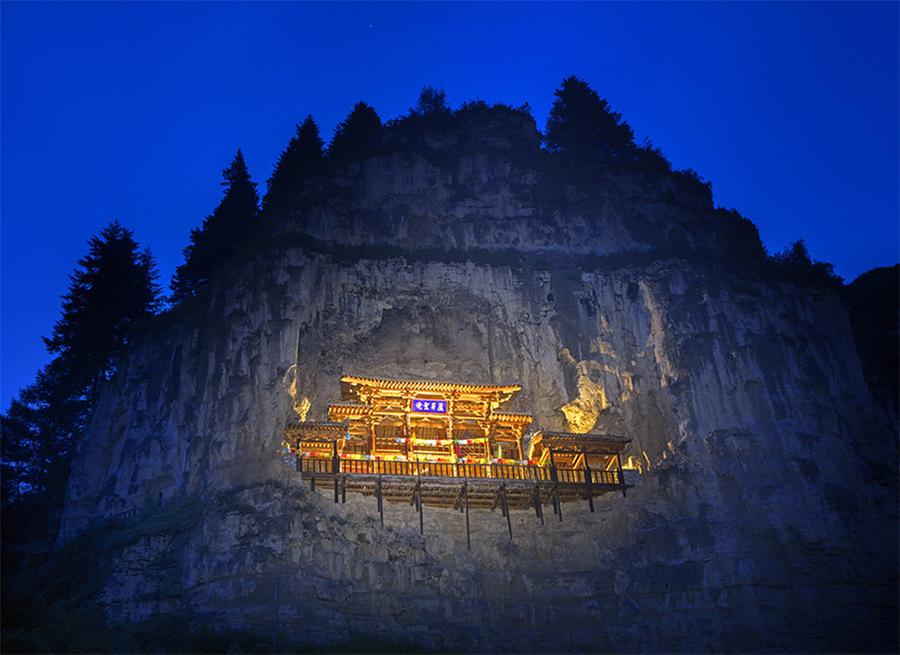 Night View of Hanging Temple by Luo Pingxi in Shanxi province. [Photo provided by cpanet.org.cn] |