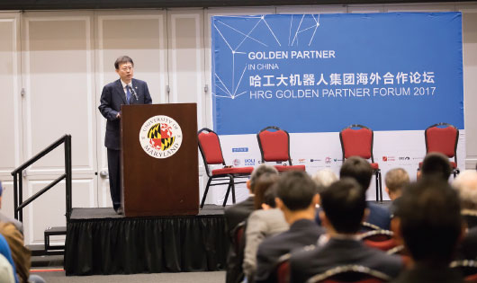 Bai Xianglin, senior vice-president of the Harbin Institute of Technology (HIT) Robot Group (HRG), talks about trends in robotics during his keynote speech at the HRG Robot Forum & Expo 2017 on Sunday in College Park, Maryland. Sam Lin / For China Daily