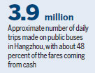 Almost 3.9 million passenger trips are made on public buses daily in Hangzhou, capital of Zhejiang province, and cash accounts for 48 percent of total fare income, about 1.7 million yuan ($247,000) a day.