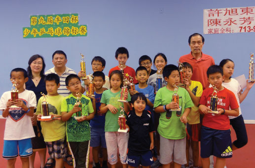 Winners of the Ninth Toyota Cup Youth Table Tennis Tournament join coach Wang Dashan after a day of competition on May 27. More than 50 youths participated in the event. Provided To China Daily