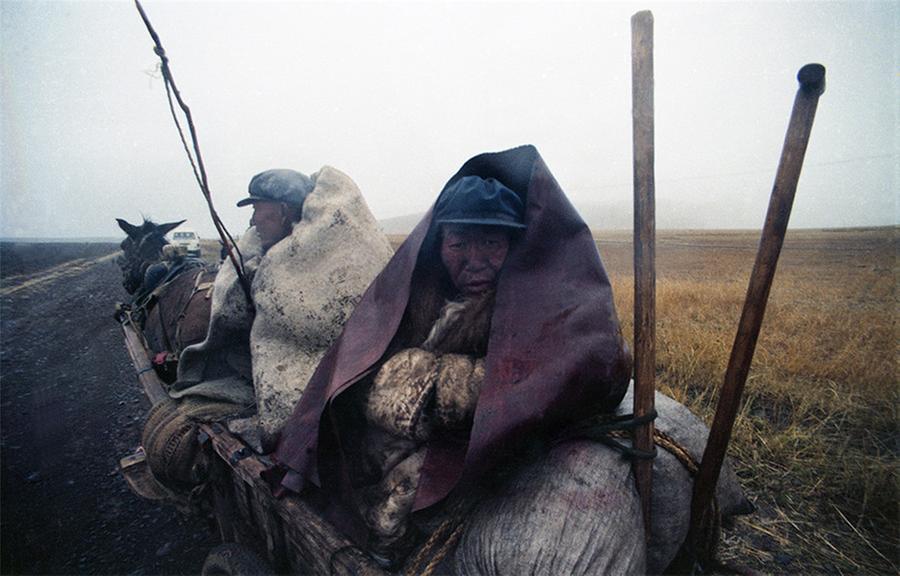 Two laborers who help others with a harvesting wheat drive sit on a horse-drawn wagon in the cold autumn rain. The photo was taken in the Hexi Corridor region in Gansu in 1991. [Photo by Zuo Zhulin/cpanet.org.cn] |