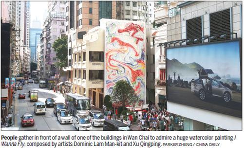 The art work I Wanna Fly combines more than 1,500 individual paintings by young people. It has been arranged with abstract expressionist methods by Hong Kong-based painter Dominic Lam Man-kit and Xu Qingping, a painter and son of art guru Xu Beihong.