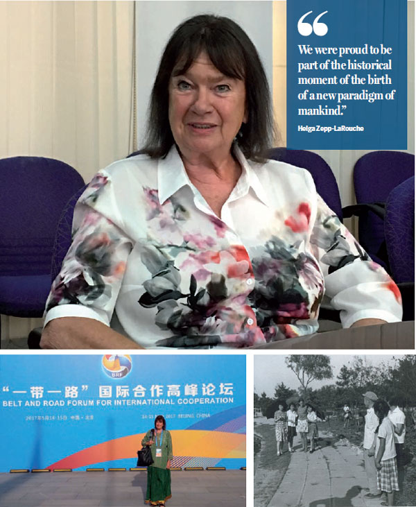 Top: Helga Zepp-LaRouche speaks to China Daily in an interview. Chen Weihua / China Daily; Left: Helga Zepp-LaRouche poses for a photo during her attendance at the Belt and Road Forum for International Cooperation in Beijing in May. Provided to China Daily; Right: Helga Zepp-LaRouche in 1971 photo taken during her first trip to China. Provided to China Daily