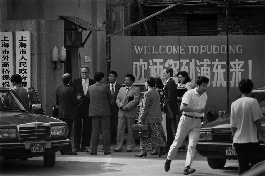Foreign investors look for development projects in front of the Shanghai Pudong Development Headquarters in 1992. [Photo provided by cpanet.org.cn]