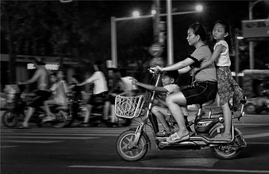 A woman drives two children on her motorcycle in Hua county, Henan province, on June 30, 2017. On Oct 29, 2015, a two-child policy was officially issued by the Chinese government. The new policy, allowing Chinese couples to have two children, was proposed in order to help address the aging issue in China. [Photo provided by cpanet.org.cn]