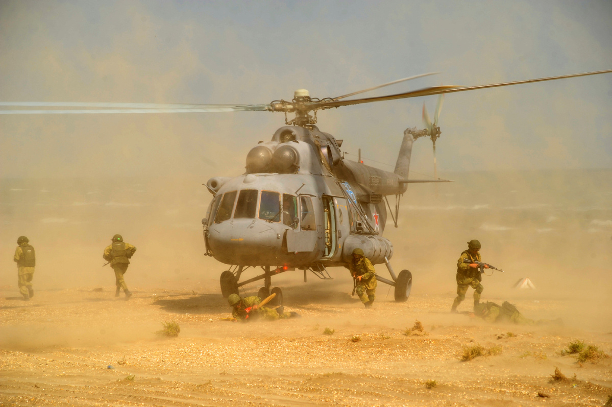 Russian marines disembark from a Mi-8 helicopter during the military exercises known as "Centre-2019" at the range Turali on the Caspian Sea coast in the Republic of Dagestan, Russia September 20, 2019. [Photo/Agencies]