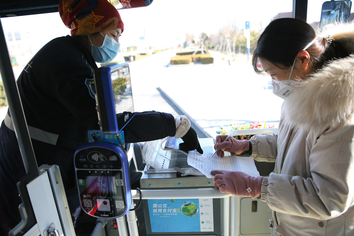 A bus driver explains the requirements for filling the registration form for passengers in Qingdao, East China's Shandong province, on Feb 18. [Photo by Zhang Jingang/for chinadaily.com.cn]