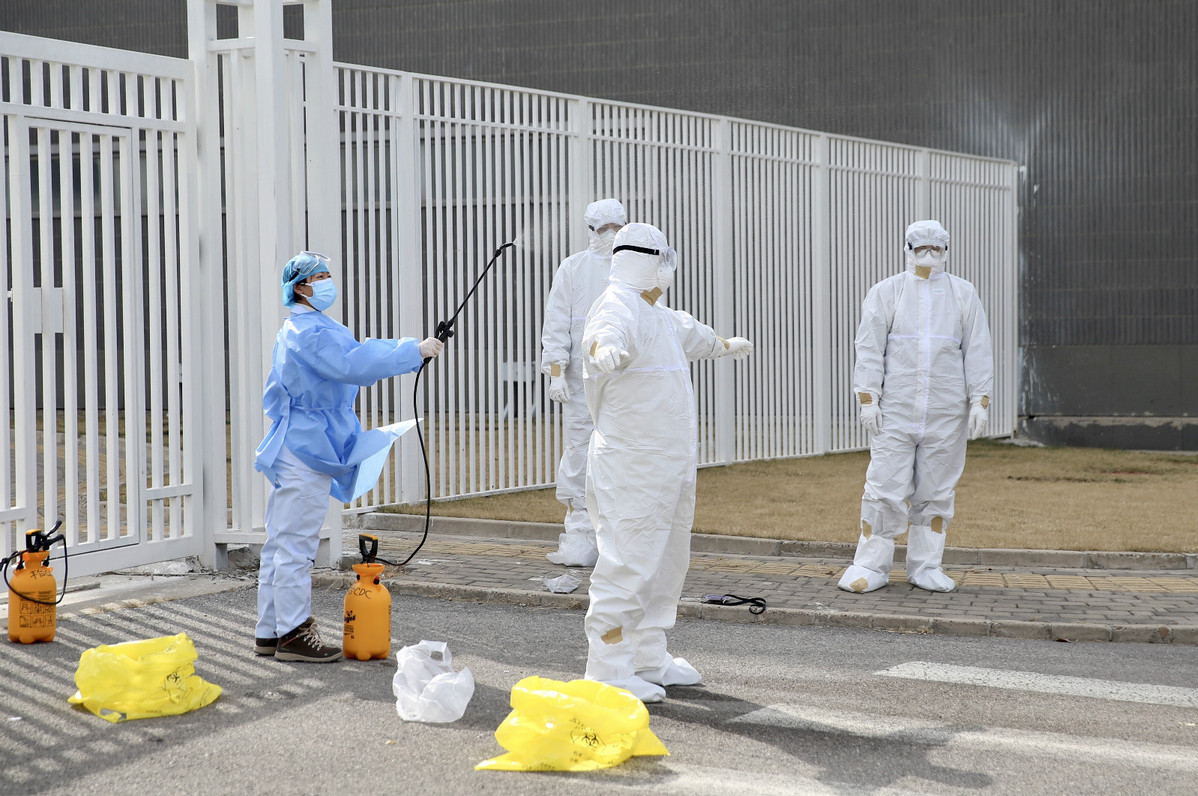 Staff are disinfected outside the transit hub of the new venue of China International Exhibition Center, on March 18, 2020. [Photo by Zou Hong/chinadaily.com.cn]