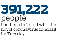 Following is Brazil, which had reported 391,222 infections and 24,512 deaths. The country on Tuesday reported the highest daily COVID-19 death toll in the world at 1,039, the fifth straight day the country has topped the list.