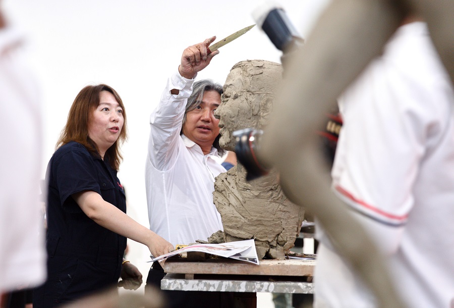Wu Weishan, right, a sculpturer and director of National Art Museum of China, offers suggestions on the sculpture of Huang Wenxiu, Aug 28, 2020. [Photo by Jiang Dong/chinadaily.com.cn]