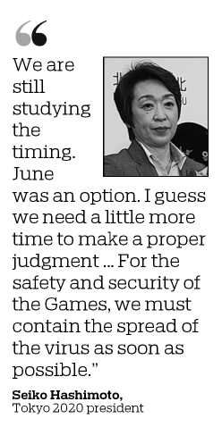 Fans from abroad have already been barred, and on Wednesday organizing committee president Seiko Hashimoto said a decision on venue capacity-or if there will be any fans at all, or just empty venues-may not be made until June. She had previously promised that decision for this month.