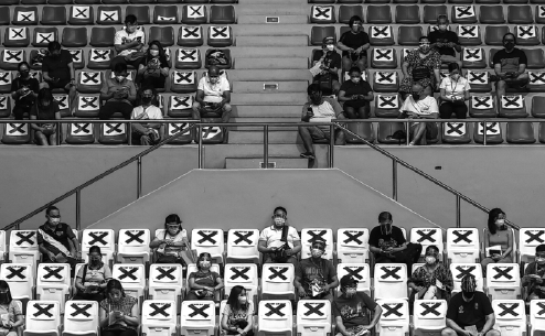 Filipino health workers and people with comorbidities wait to get COVID-19 vaccines at a sports center in the Makati city of Metro Manila on Tuesday. ELOISA LOPEZ/REUTERS