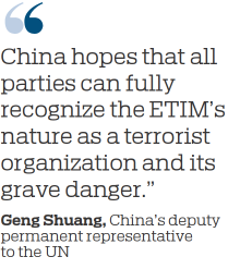 "We urge relevant country to take into account the big picture in international counterterrorism cooperation, reverse its wrong decision immediately, and redesignate ETIM as a terrorist organization," Geng Shuang, China's deputy permanent representative to the UN, told a meeting of the General Assembly's Sixth Committee on Wednesday.