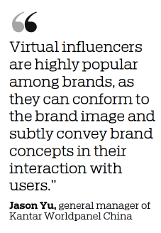 "Virtual influencers are highly popular among brands, as they can conform to the brand image and subtly convey brand concepts in their interaction with users," said Jason Yu, general manager of consultancy Kantar Worldpanel China.