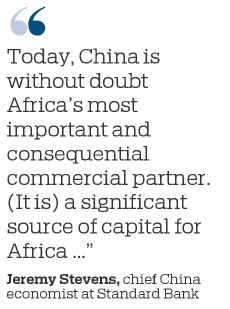 "Today, China is without doubt Africa's most important and consequential commercial partner. (It is) a significant source of capital for Africa, laying the foundation for African economic growth, development and industrialization," said Jeremy Stevens, chief China economist at Standard Bank, Africa's largest bank that is headquartered in South Africa and operates in more than 20 economies.