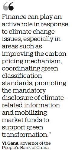 "Finance can play an active role in response to climate change issues, especially in areas such as improving the carbon pricing mechanism, coordinating green classification standards, promoting the mandatory disclosure of climate-related information and mobilizing market funds to support green transformation," Yi Gang, governor of the People's Bank of China, said at the European Union's first sustainable investment summit in October.
