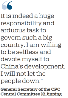 "It is indeed a huge responsibility and arduous task to govern such a big country," Xi said when answering a question from a foreign politician. "I am willing to be selfless and devote myself to China's development. I will not let the people down."