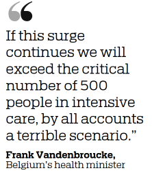 In Belgium, Health Minister Frank Vandenbroucke has urged people "to get ready to work from home" as COVID-19 infections and hospitalizations rise in the country. Some 1,900 COVID-19 patients were reported to be in hospitals, including 360 in intensive care; on both counts, the figures are the highest since June.