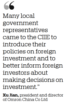 "Many local government representatives came to the CIIE to introduce their policies on foreign investment and to better inform foreign investors about making decisions on investment," said Xu Jian, president and director of Omron China Co Ltd.