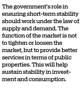 First, mid and long-term reform and changes in long-term mechanisms must be advanced with resolute efforts, and this process should be maintained even with temporary disruptions. Second, strong intensity is needed in short-term stabilization and defusing of systematic risks. This is because deleveraging is by nature a risky process. Short-term stability cannot be used as an excuse to halt reforms. Third, the government's role in ensuring short-term stability should work under the law of supply and demand. The function of the market is not to tighten or loosen the market, but to provide better services in terms of public properties. This will help sustain stability in investment and consumption.